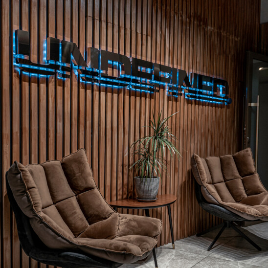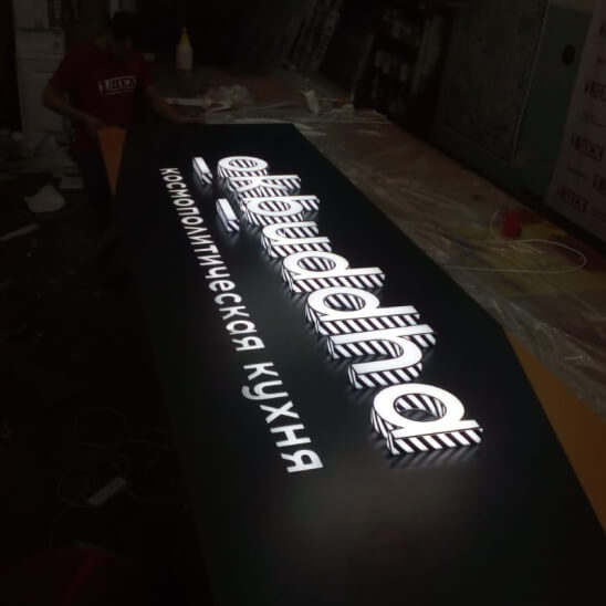 Задник объемных букв с контражуром рассеивает свет по подложке или стене. Монтаж такой вывески производиться на определенном расстоянии от фона, чтобы создать эффект контурной подсветки.